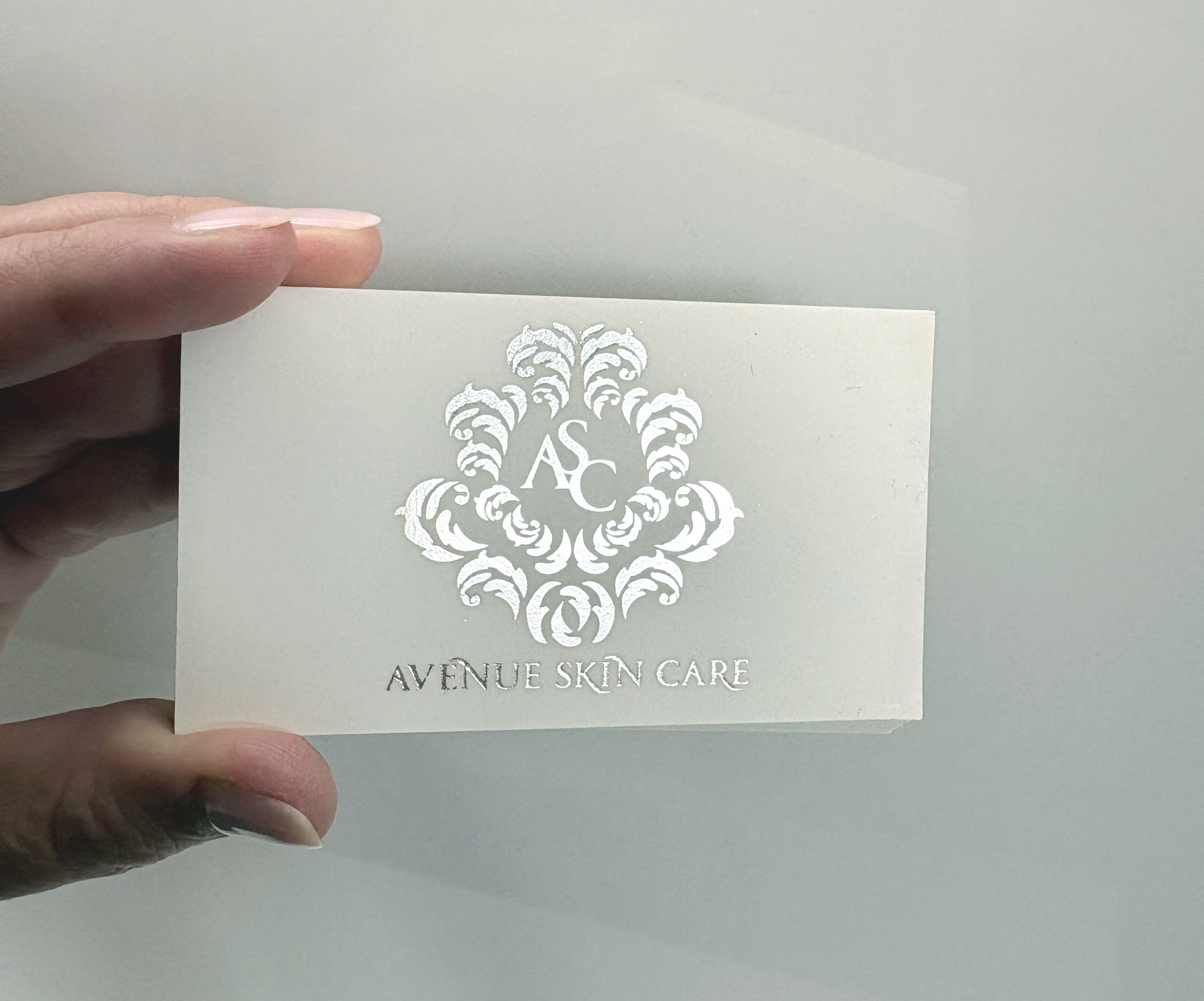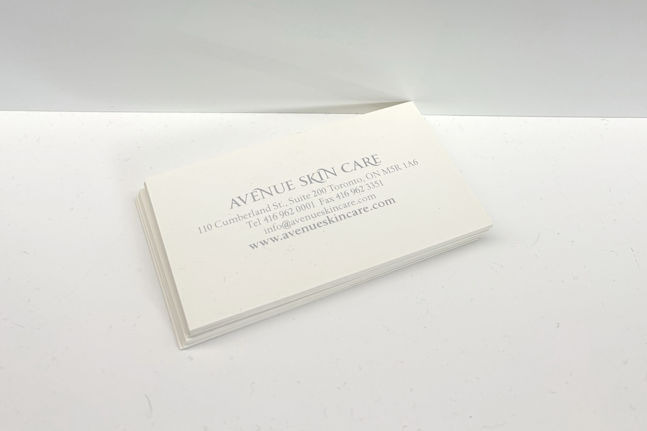Business cards were produced on silky, smooth, and soft-to-the-touch white natural coloured Touché stock, emulating the feel of bright soft skin, and finished with a metallic silver foil stamp. Print production pricing and management were also handled to ensure a cohesive, high-quality presentation across all materials.