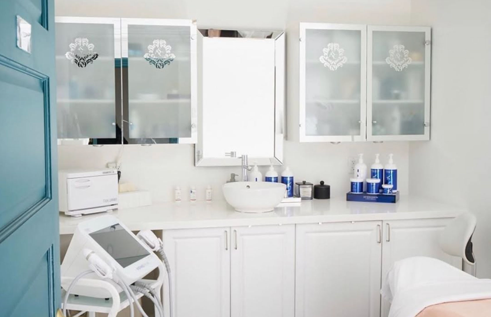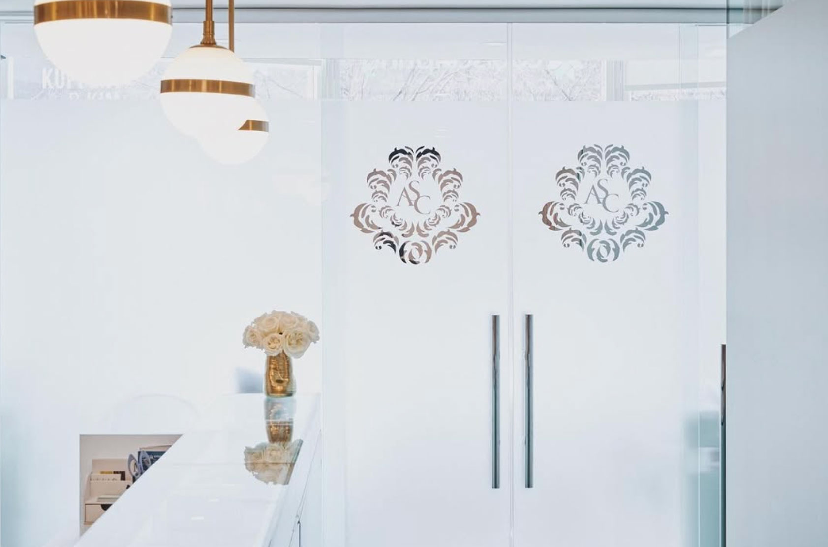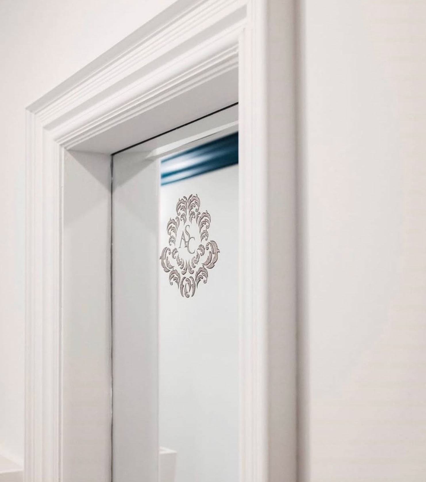 The work included custom interior graphics, a CNC-cut door logo, silver metallic wall lettering, and the design of the brand’s logo. The logo was developed together with a custom flocked interior wallpaper, with all elements working together to symbolize blossoming renewal and rejuvenation in skin care.